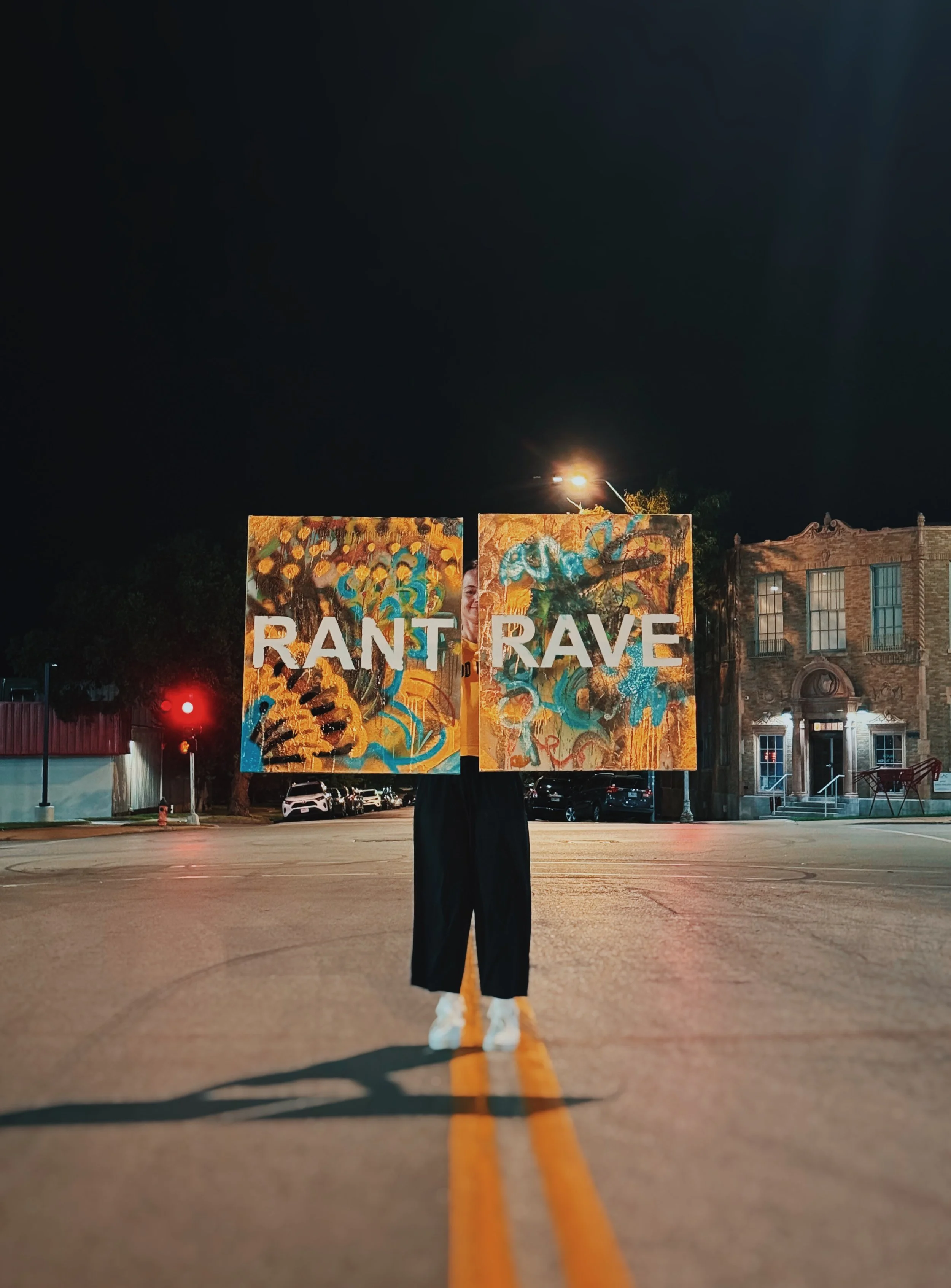 Executive Director, Courtney Wasson, holds canvasses created by the community at Rant & Rave Event. Photo by Kevin Townsend, KCAC Board Member and artist.
